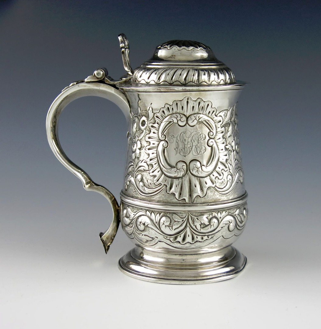 baluster form, later embossed foliate scroll decoration and with later monograms, domed hinged cover, pierced thumb-piece, scroll handle, on a raised circular foot, height 20cm, approx. weight 23oz.