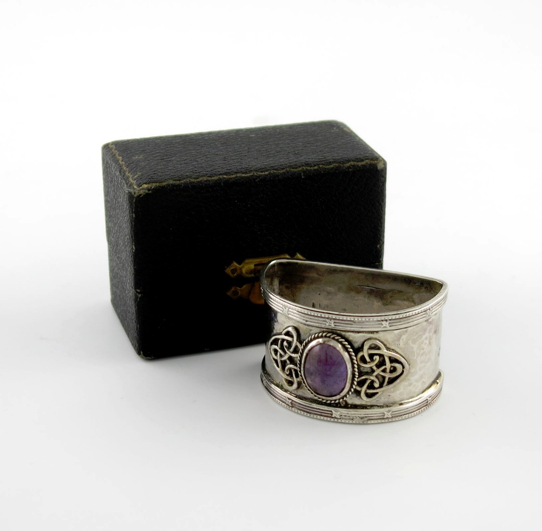 'D' shape, applied with intertwined Celtic wirework and mounted with a purple amethyst cartouche, spot-hammered decoration, rope-work borders, later case, length 5.2cm, approx. weight 1.2oz.