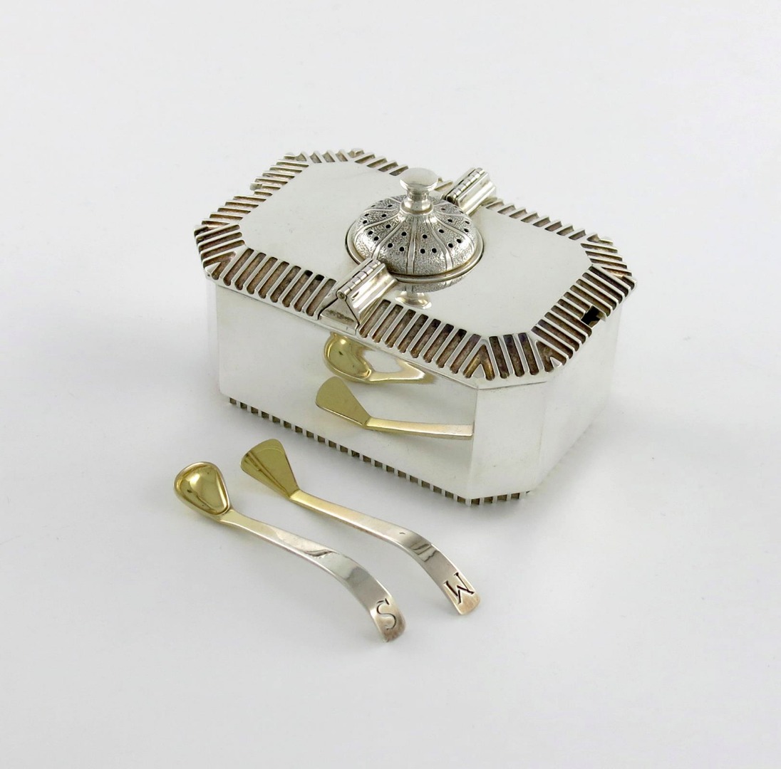 modelled as an 18th century silver spice box, rectangular form, canted corners, fluted borders, with two hinged compartment for salt and mustard, with blue glass liners and two condiment spoons, the terminals pierced 'S' and 'M', (spoons London 1969), the centre with a pull-out pepper pot, the cover with matted decoration, length 11.8cm, approx. weight 20oz.