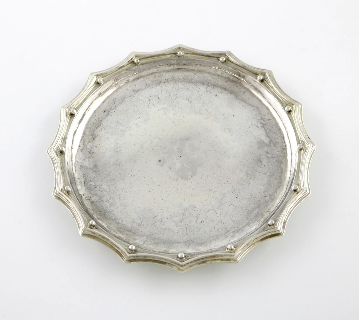 circular form, wavy-edge border, applied with ball motifs, spot-hammered decoration, diameter 16.8cm, approx. weight 6.2oz.