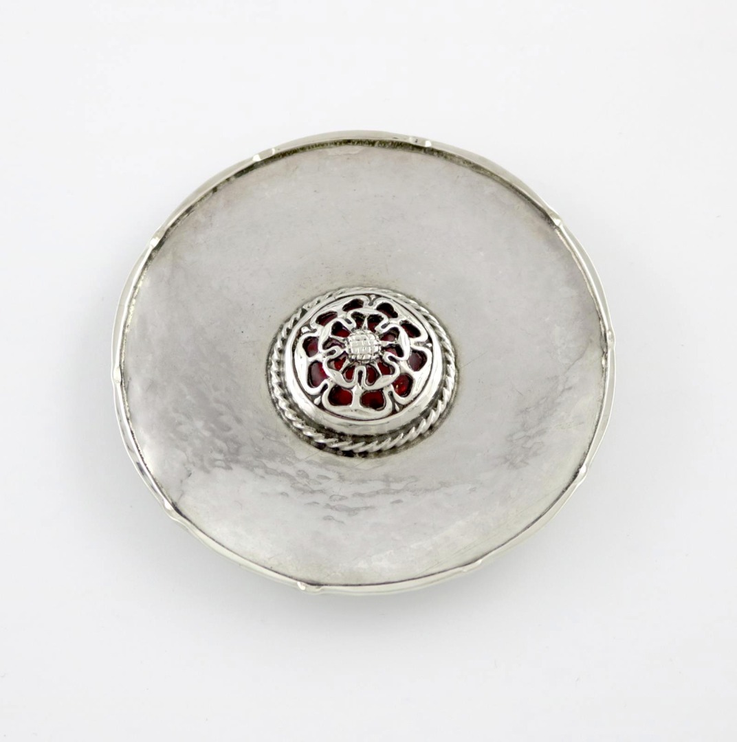 circular form, spot-hammered decoration, the centre with a red enamel Tudor rose, crimped border, diameter 7.5cm, approx. weight 1.3oz.