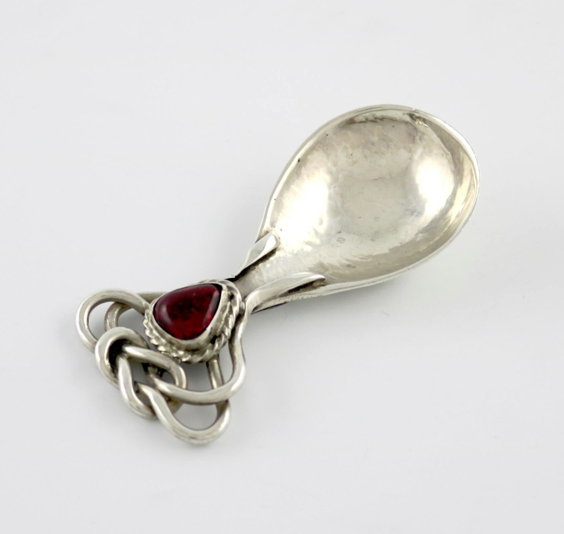 By Omar Ramsden, an Arts and Crafts silver and enamel caddy spoon,
