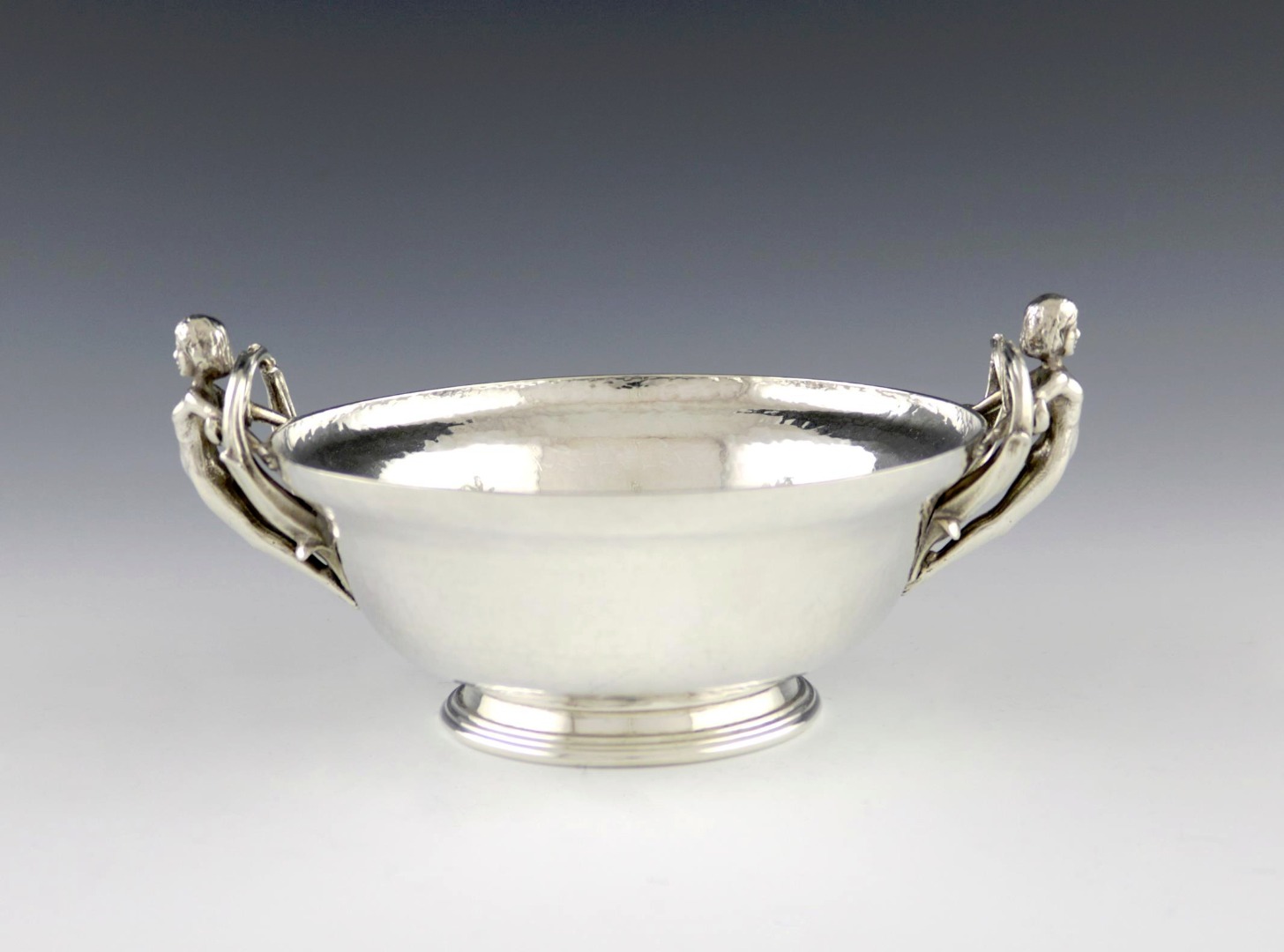 tapering circular form, spot-hammered decoration, with trifurcated nude figural handles, the underside inscribed 'To Charlotte from her Godfather George Lewis', length handle to handle 18.5cm, approx. weight 14oz.