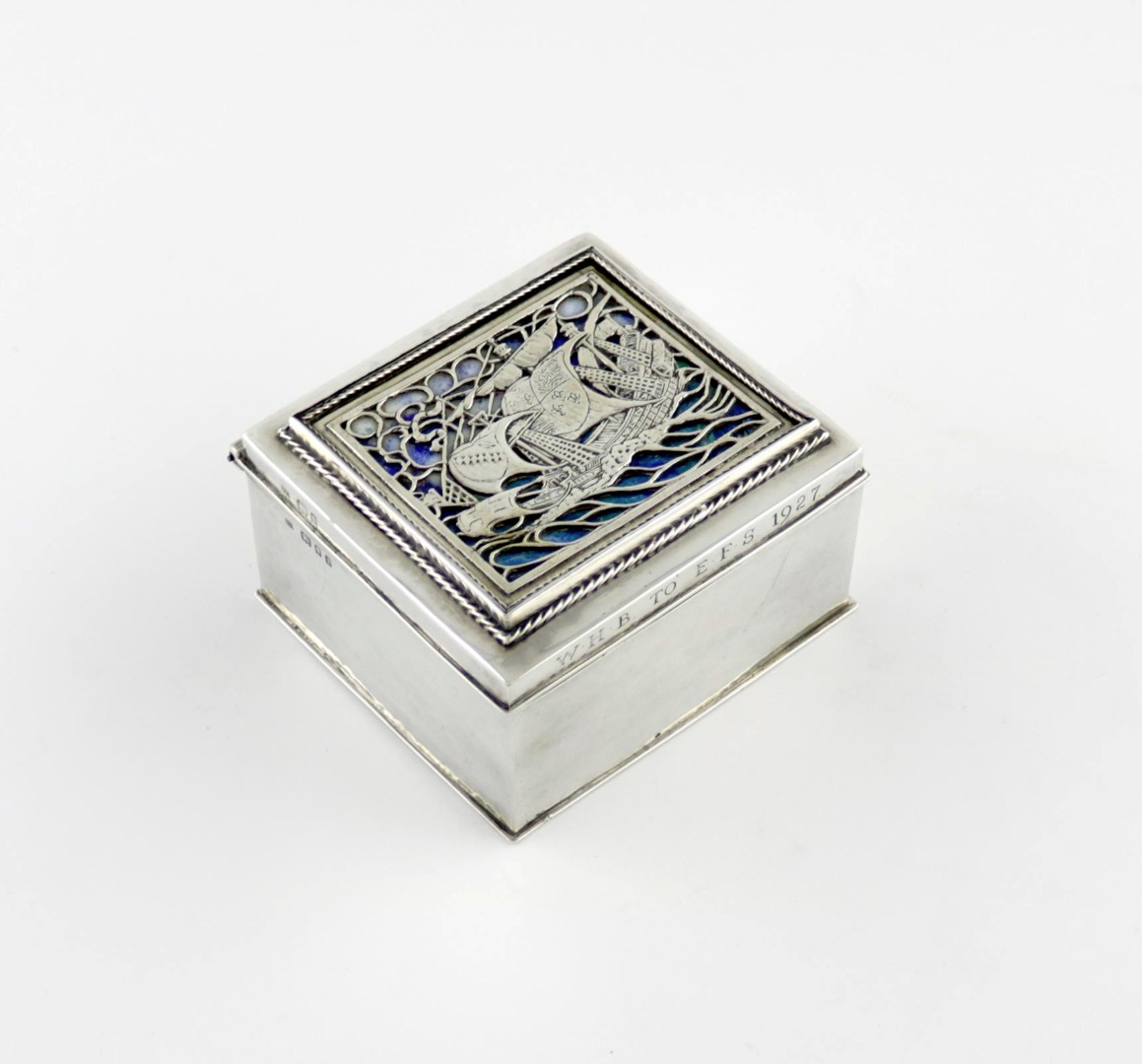 By Omar Ramsden, an Arts and Crafts silver and enamel cigarette box,