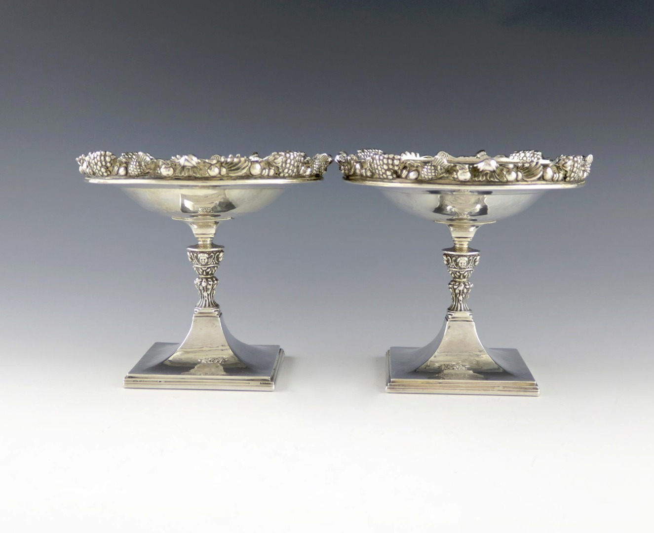 tapering circular bowls, spot-hammered decoration, foliate scroll, shell and fruit border, the knopped stems with cherubs' heads and fluted decoration, on a raised square foot with a reeded border, height 13.8cm, approx. weight 47oz. (2)