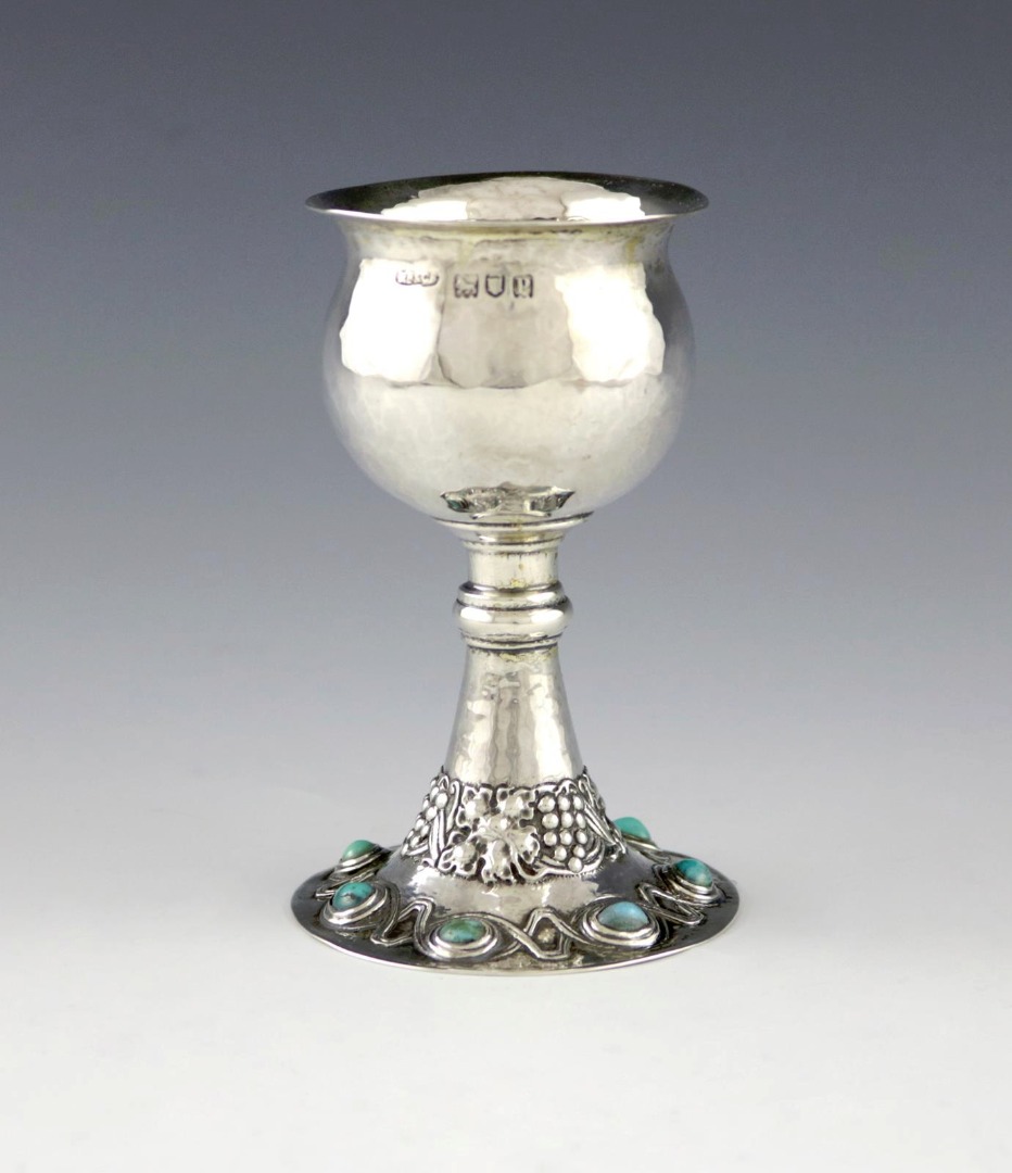 circular bowl, spot-hammered decoration, on a knopped tapering circular stem, embossed with trailing grapevines, on a spread circular foot applied with seven turquoise cabochons, height 10cm, approx. weight 2oz.
