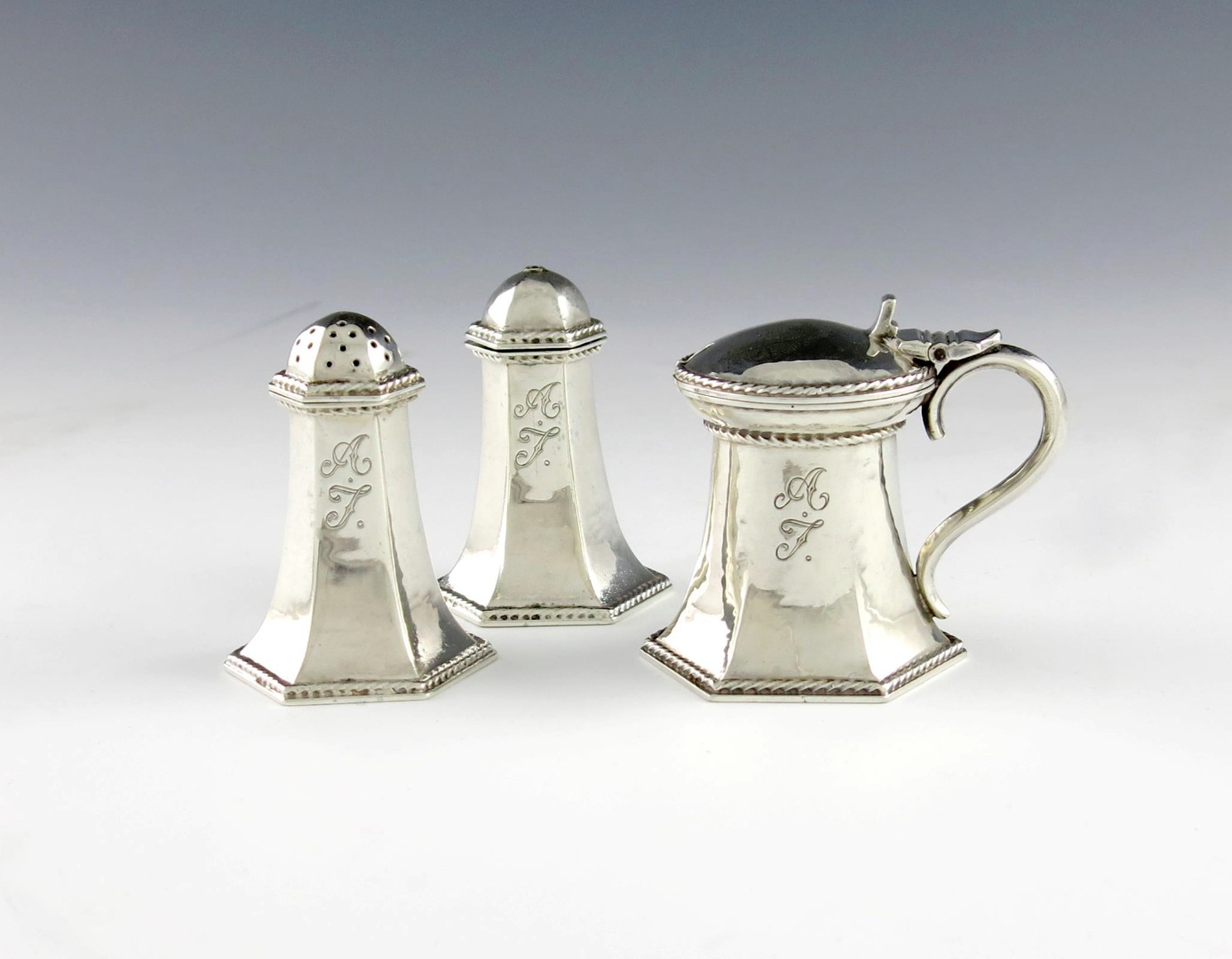 tapering hexagonal form, spot-hammered decoration, rope-work border, the mustard pot with a scroll handle and hinged cover, and with a later liner, height 6.3cm, approx. weight 6.9oz. (3)