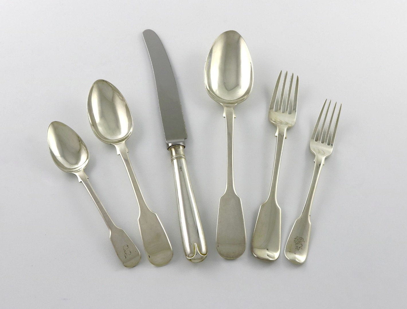 A matched William IV and Victorian silver Fiddle pattern canteen for six