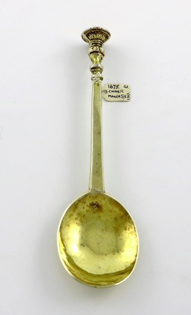 A Charles II heavy-gauge silver-gilt Seal-top spoon,
