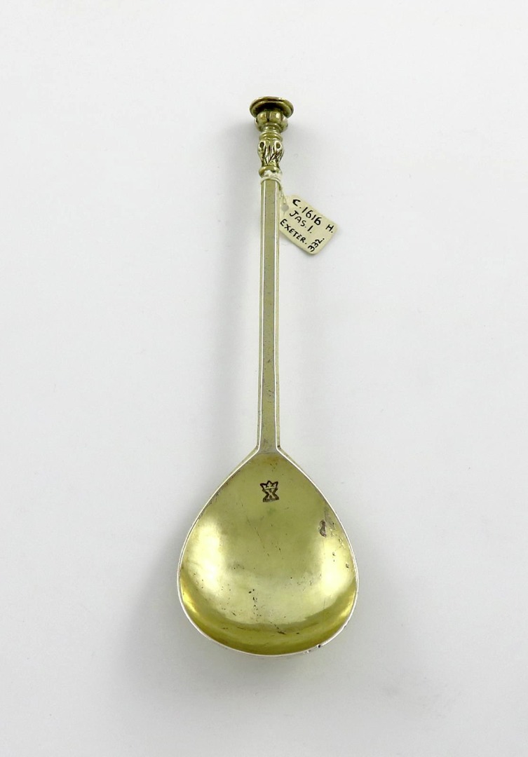 fig-shaped bowl, faceted slight tapering stem, the seal-top finial prick-dot initialled 'W.S', the reverse of the bowl prick dot initialled 'L.H' and dated '1616', within scroll mantling, length 17.6cm, approx. weight 1.7oz.