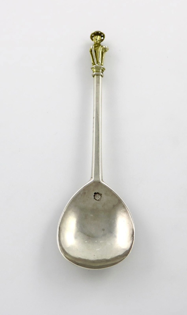 the reverse of the fig-shaped bowl scratch initialled 'S.W', the reverse of the slight tapering faceted stem incuse stamped 'IT', gilded Apostle finial, pierced nimbus, length 17.8cm, approx. weight 1.9oz.