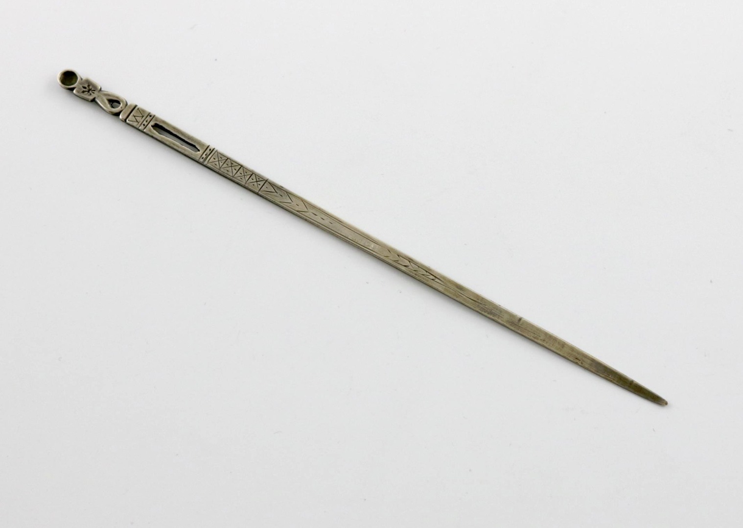 flattened tapering form, engraved decoration, with an eye and slot, and a small 'cup' spatula, scratch initialled 'H' and 'W', length 13.6cm, approx. weight 0.1oz.