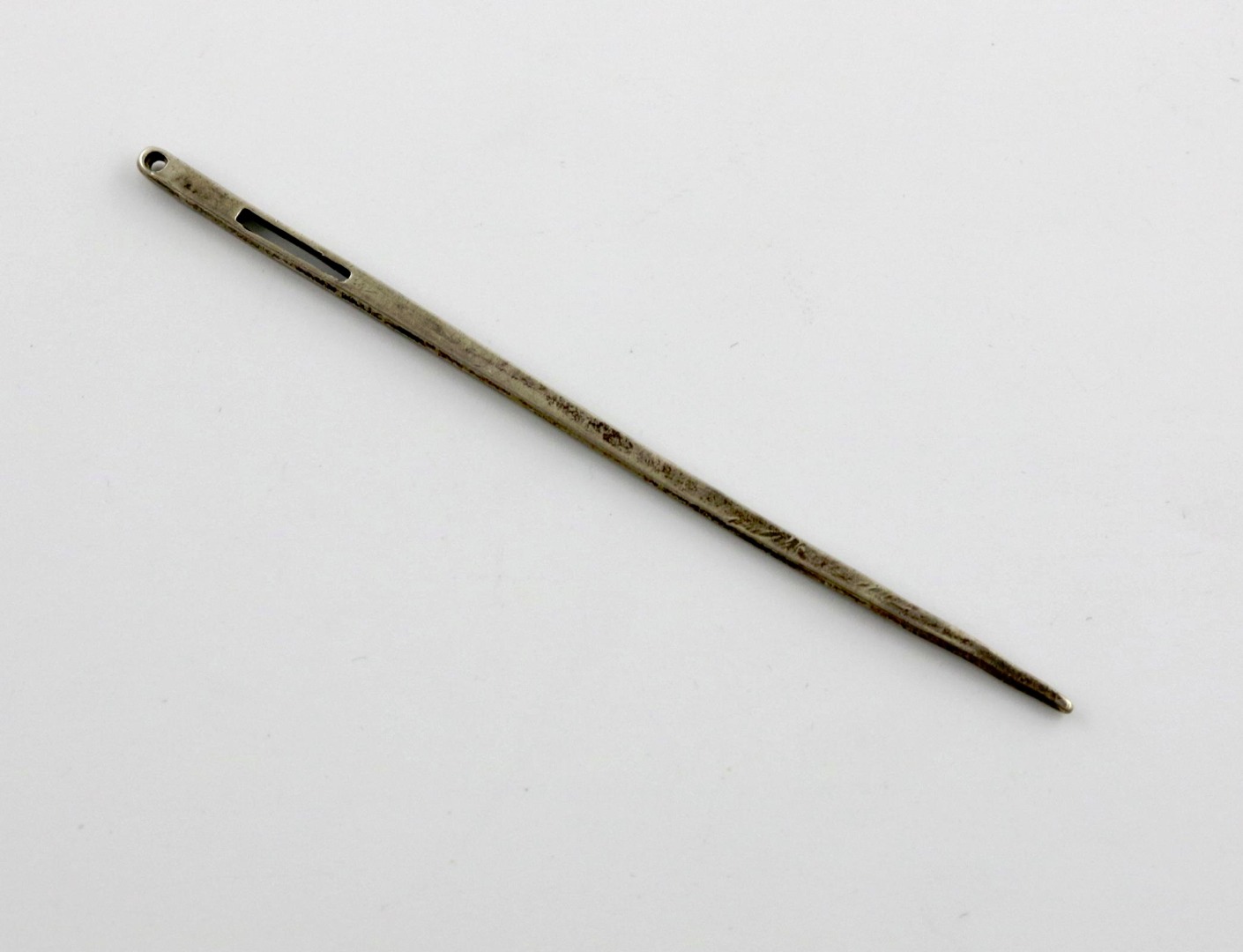 plain flattened hexagonal tapering form, with an eye and slot, length 10.7cm, approx. weight 0.1oz.