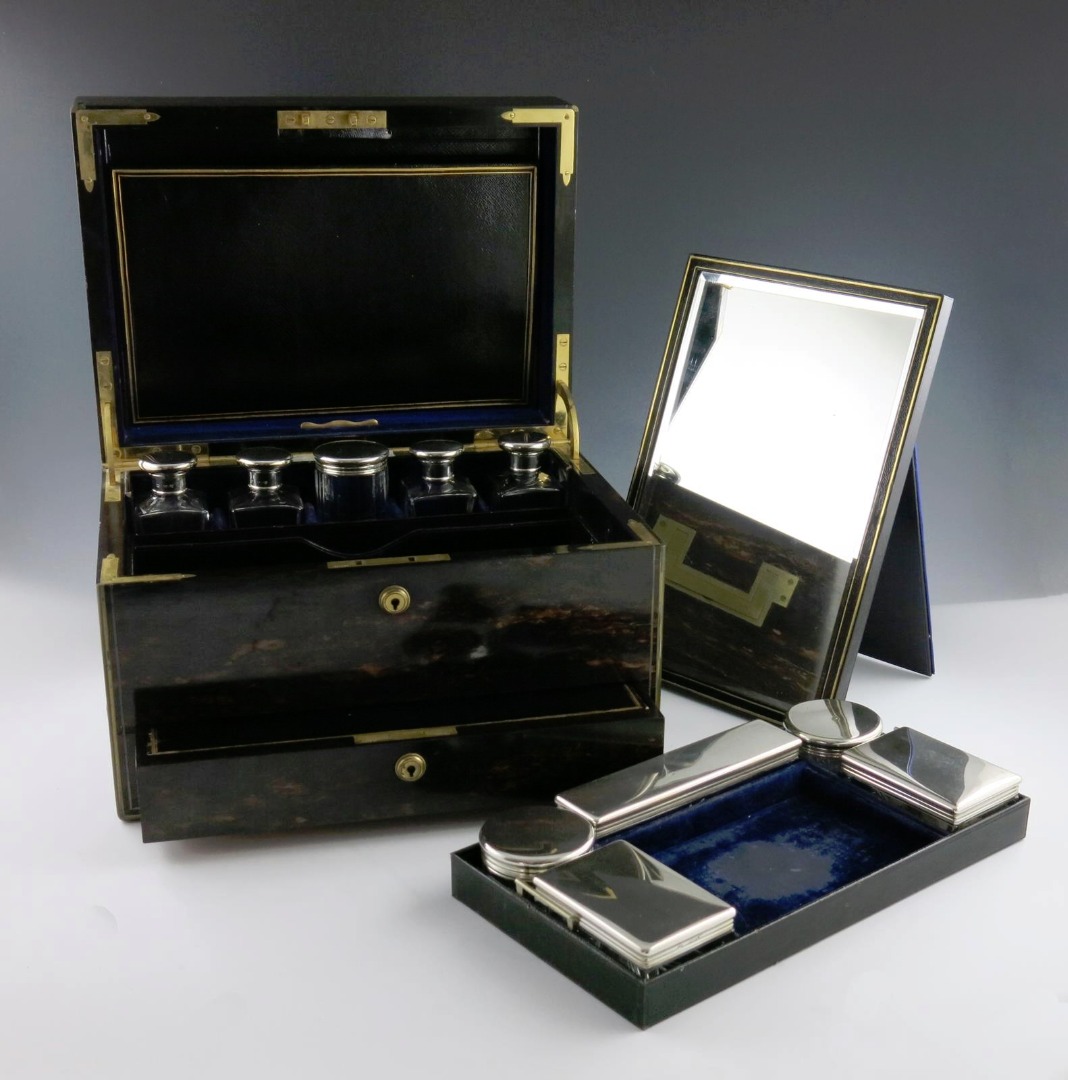 plain covers, comprising: three rectangular boxes, two circular boxes, a jar and four scent bottles, one glass body damaged, in a fitted brass bound coromandel case, the interior of the velvet lined cover with a mirror and stationary wallet, pull-out tray, and with a push-button jewellery tray with a writing cover, the hinged cover with a monogram, length 35.7cm, approx. weighable 13oz.