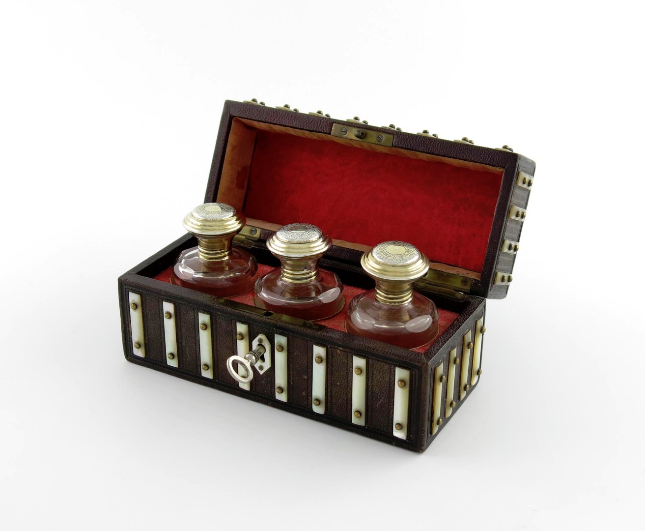 cylindrical faceted glass bodies, the mounts with engraved decoration, in a fitted red velvet lined leather case with applied mother-of-pearl decoration, with a lock and key, length of case 15.3cm.