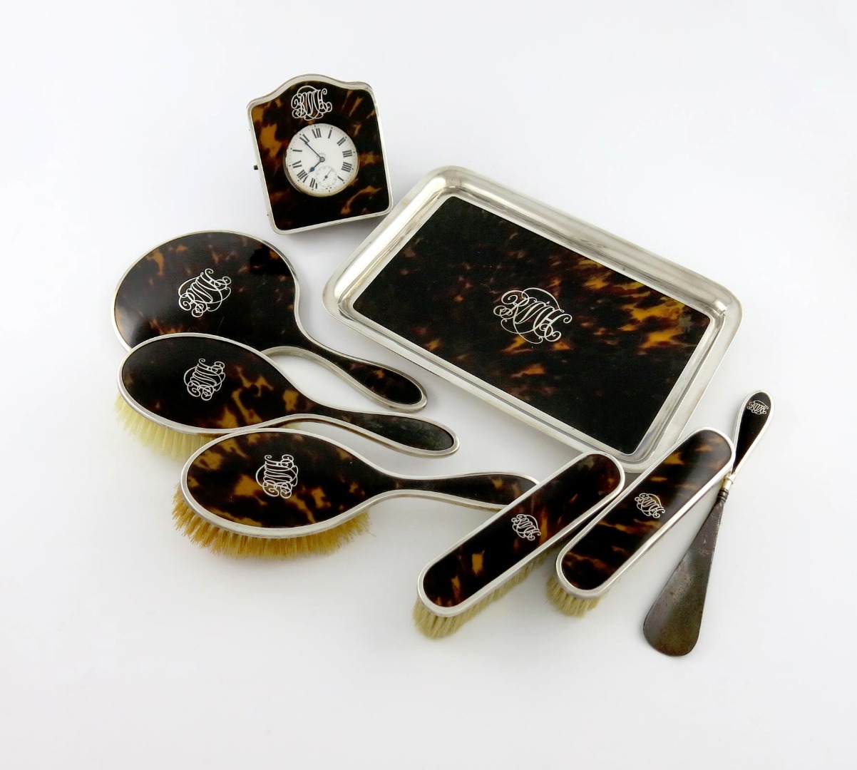 λAn eight-piece silver and tortoiseshell dressing table set