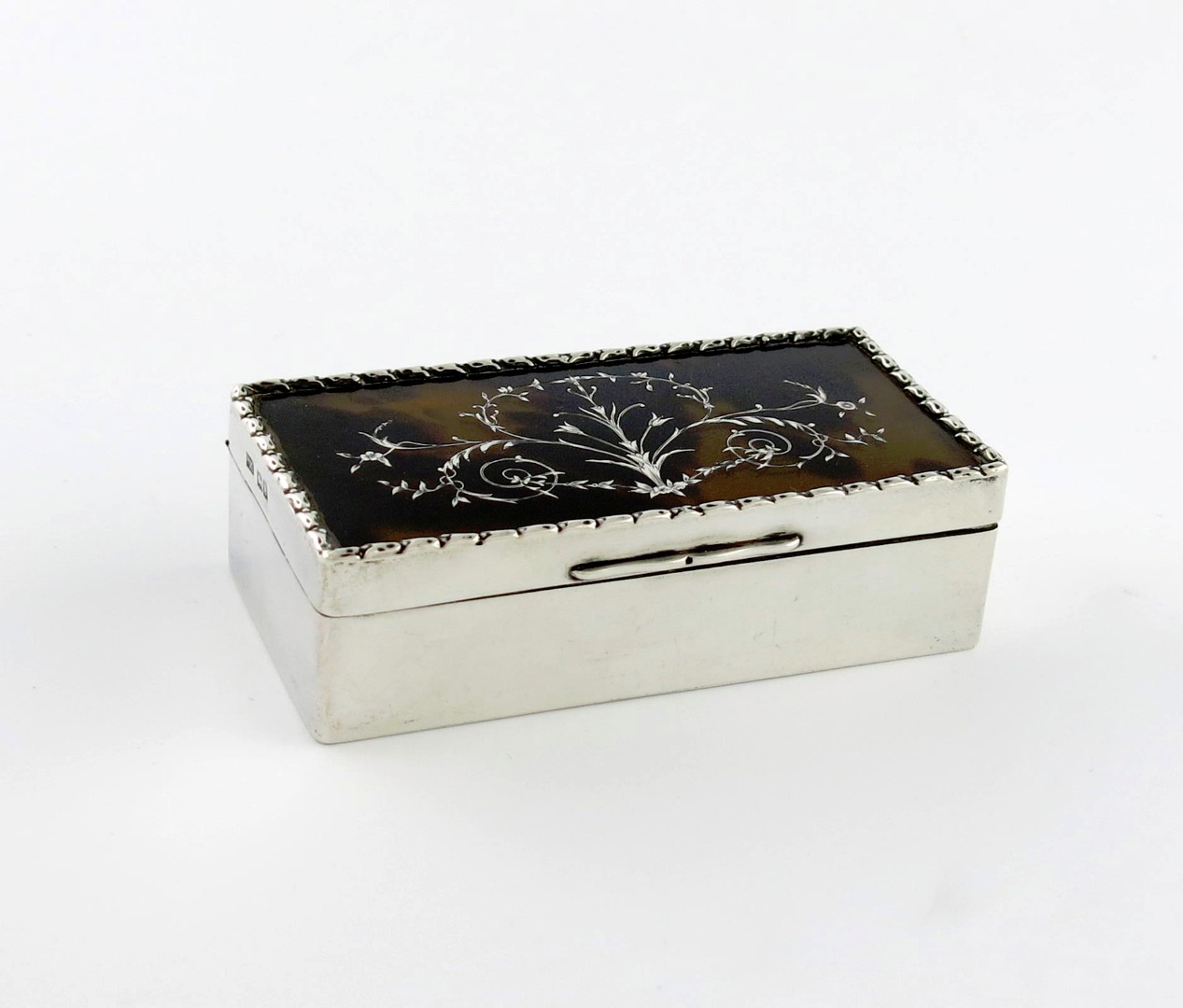 rectangular form, husk border, the hinged cover inlaid with foliate scroll decoration, length 10.1cm
