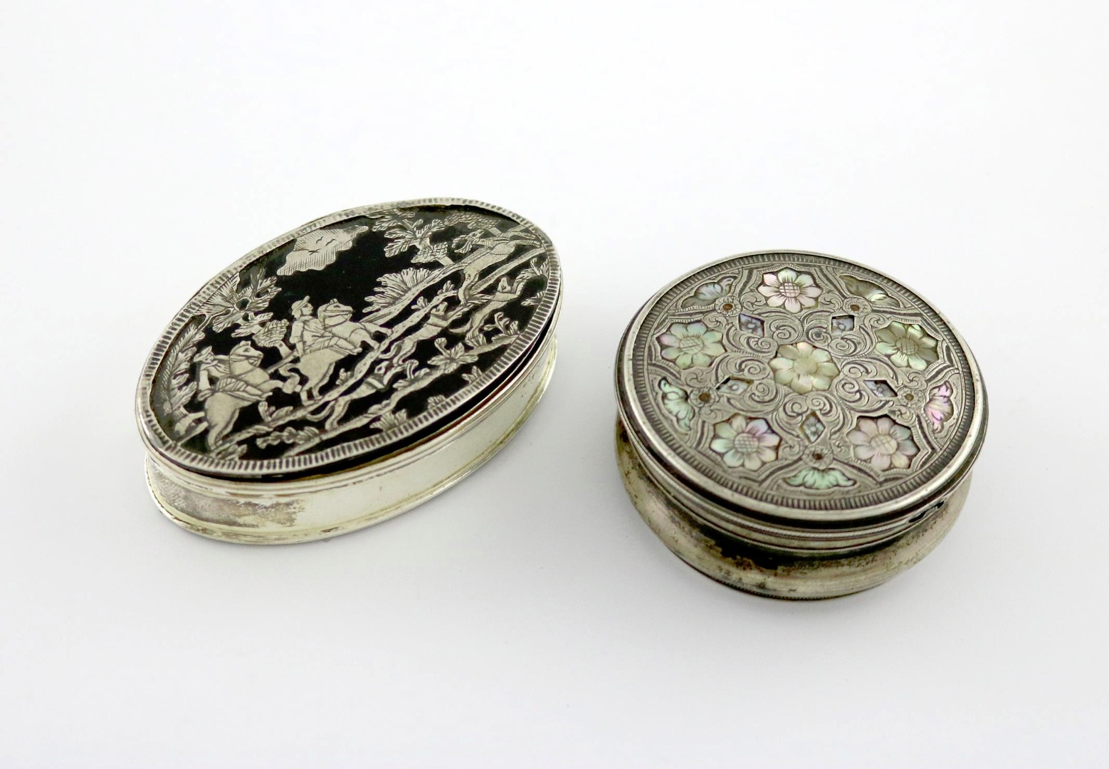 oval form, the pull-off cover inlaid with a hunting scene of two horses and dogs chasing a stag, length 7.5cm, plus a silver and tortoiseshell snuff box, unmarked, circa 1750, circular form, the pull-off cover inlaid with mother-of pearl and with engraved decoration, diameter 5.8cm. (2)
