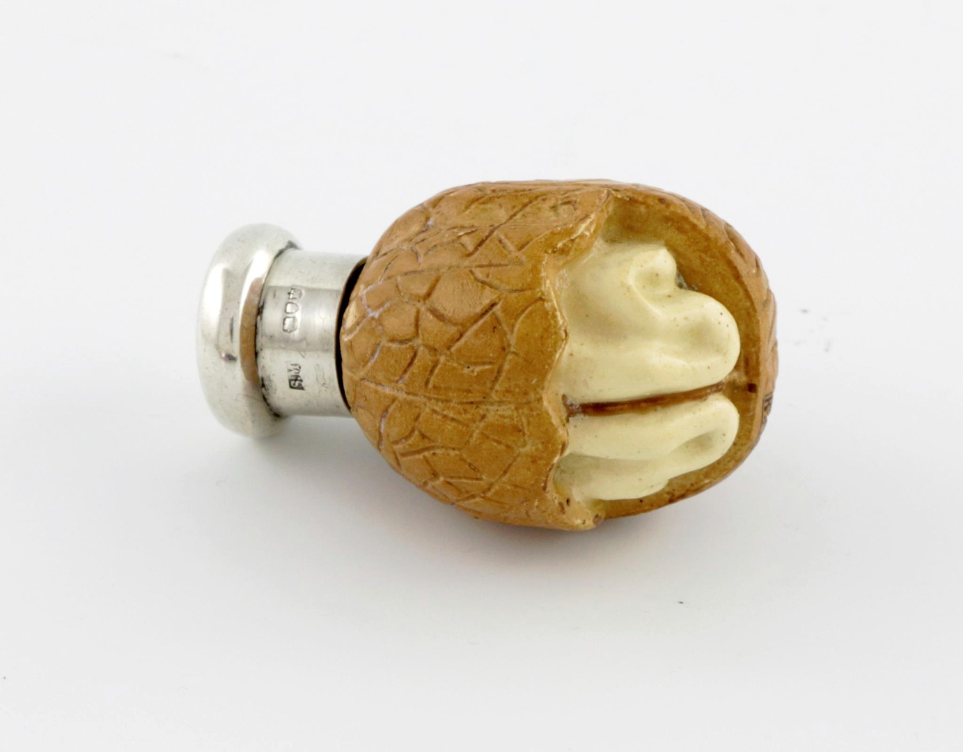 in the form of a cracked walnut, ceramic body, with a screw-off cover, length 5cm.