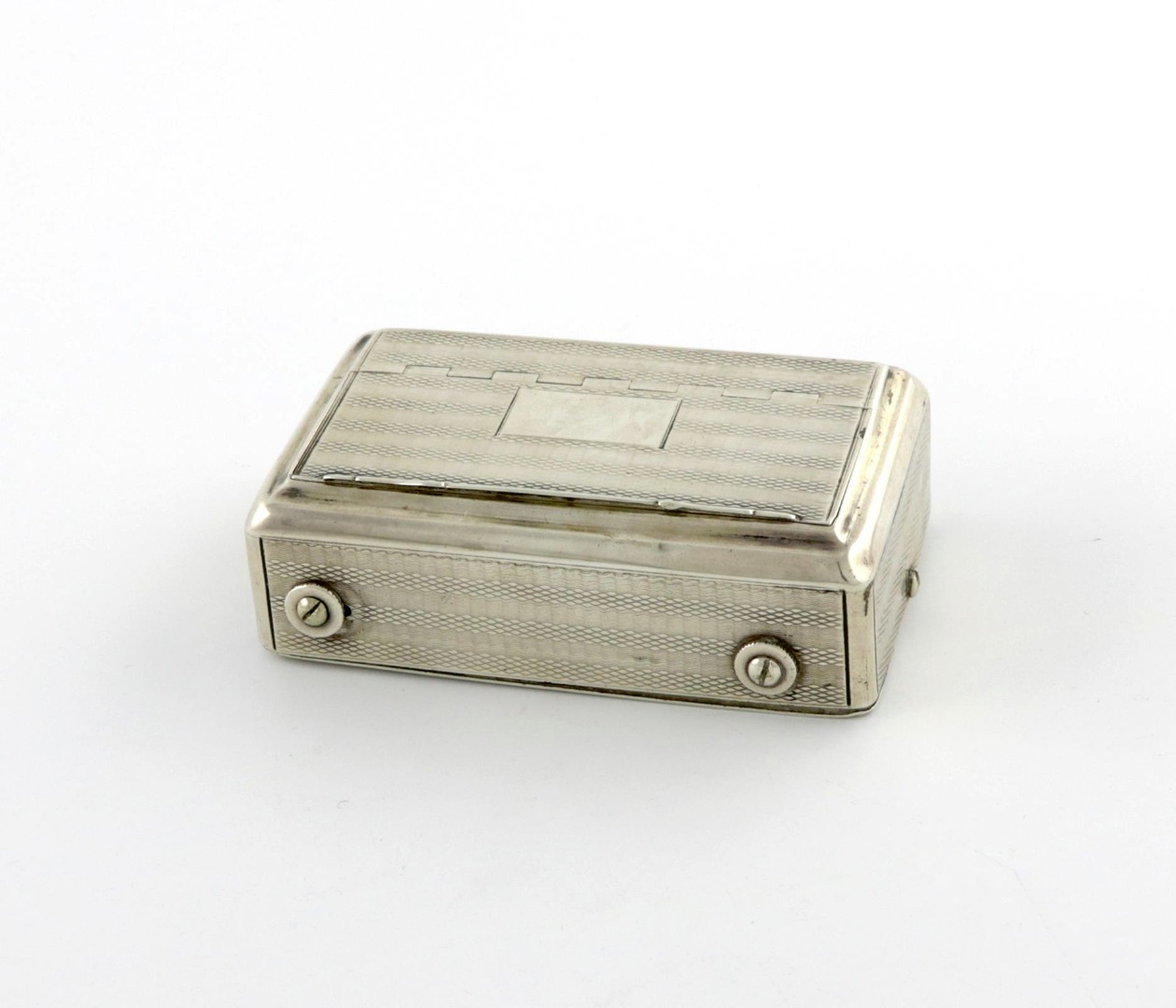 rectangular form, engine-turned decoration, the hinged cover with a plain thumb-piece and vacant cartouche, with a key, length 8.9cm.