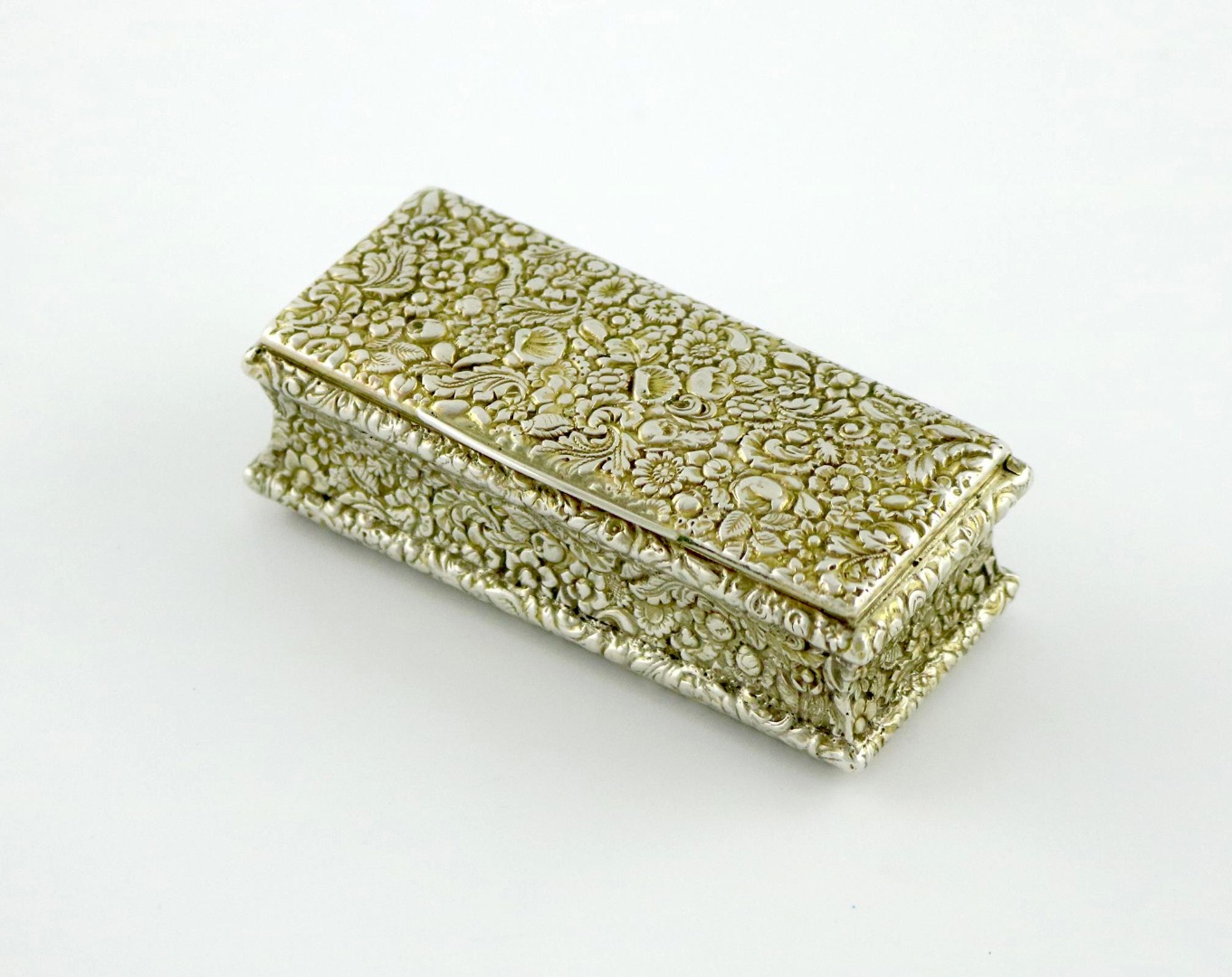 rectangular form, chased foliate scroll and shell decoration, plain thumb-piece, length 8.5cm, approx. weight 3.7oz.