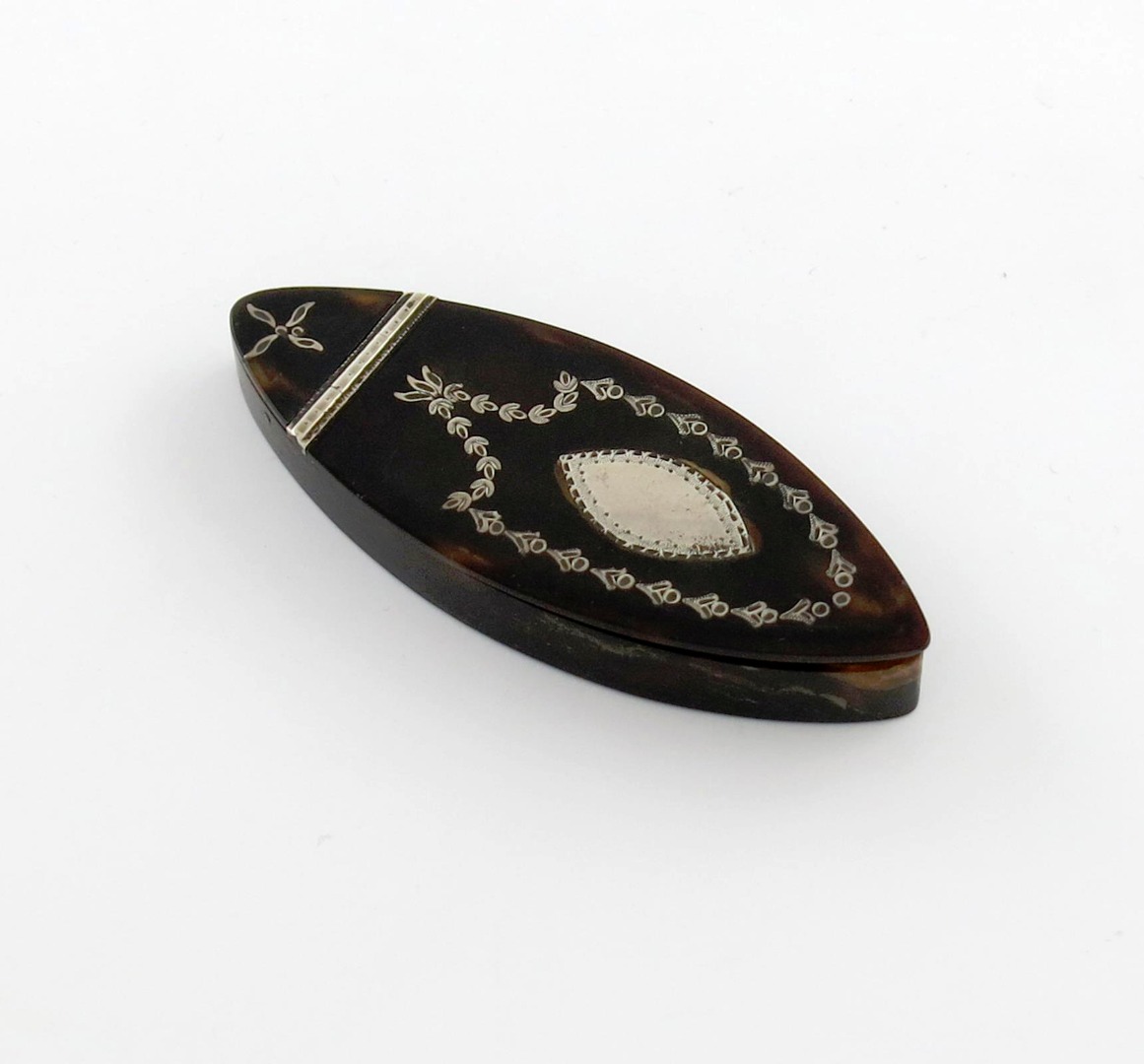 oval navette form, the hinged cover inlaid with pique decoration and with an oval cartouche, the velvet lined interior with a mirror, length 8.8cm.