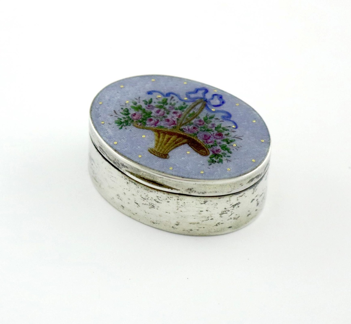oval form, the hinged cover enamelled with a basket of flowers, on a light blue ground, length 4.3cm, approx. weight 0.9oz.