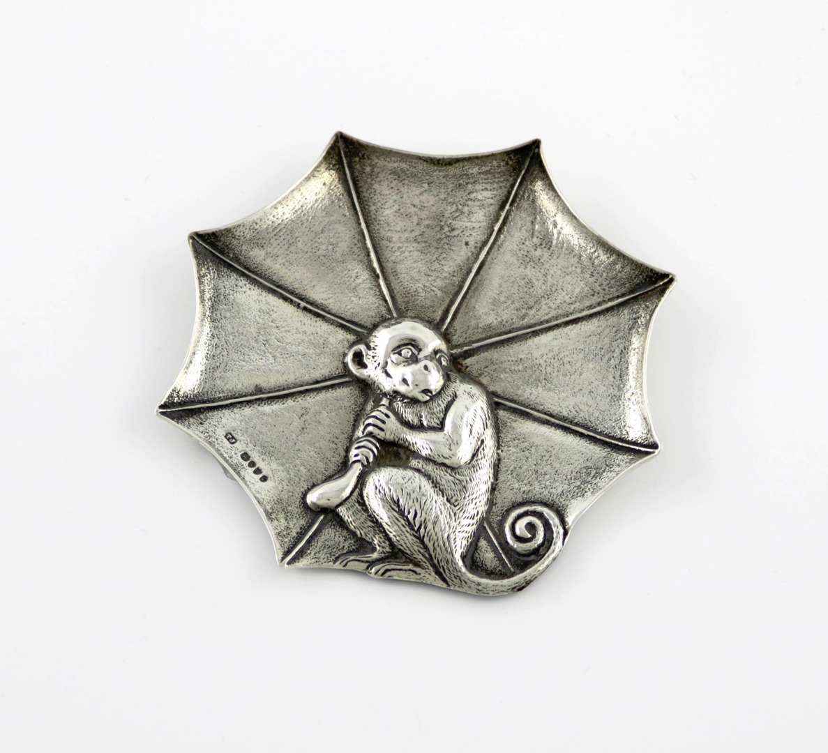 modelled as a monkey holding a parasol, octagonal form, length 11.8cm, approx. weight 2oz.