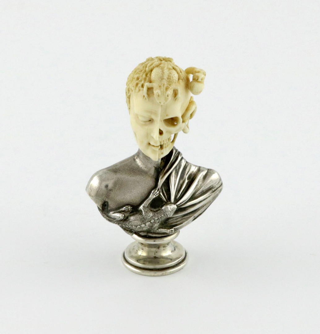 modelled as the bust of a man, the ivory head carved in two with one side showing the face and hair, the other side the skull and vertebrae, with a snake, the silver body with drapes and a lizard, the matrix carved engraved with an armorial, height 9.5cm.