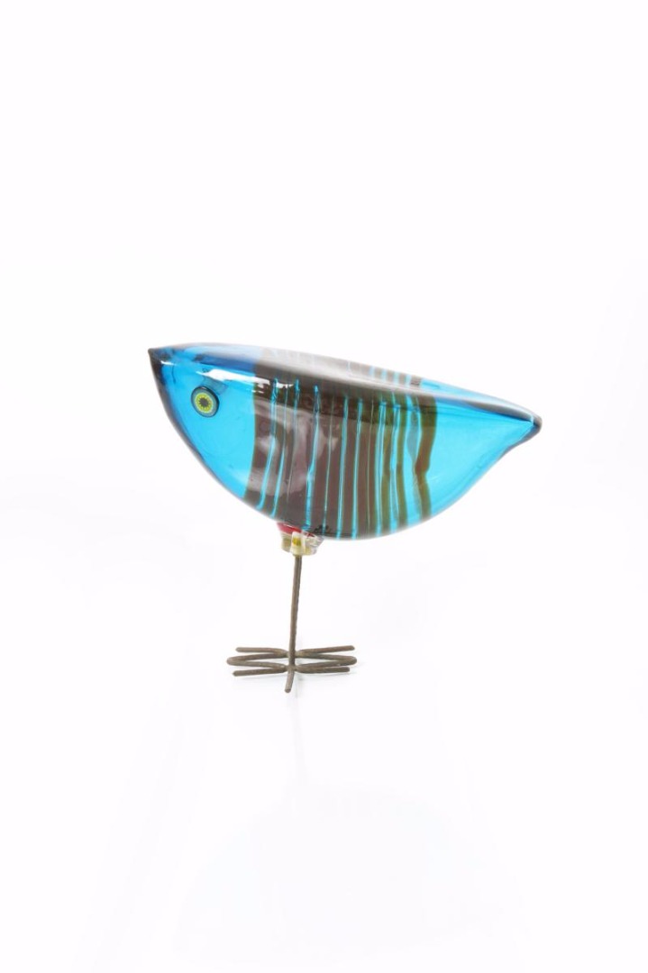 A Vistosi Pulcini glass bird designed by Alessandro Pianon, the blown blue glass body internally decorated with red stripes, applied glass cane eyes, on copper feet unsigned 18cm. high