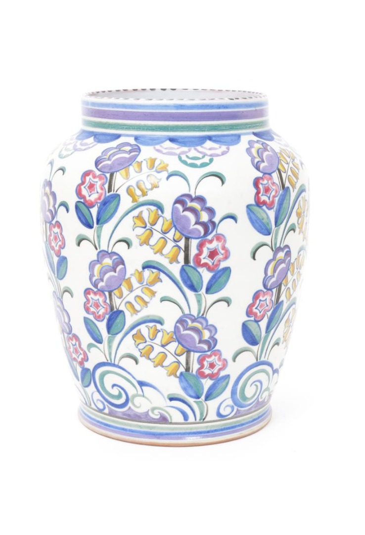 A Carter Stabler & Adams Poole Pottery vase probably designed by Truda Carter, shape no. 435, shouldered cylindrical form, painted with stylised flowers and foliage in colours on a white ground impressed mark, incised 435, 28cm. high