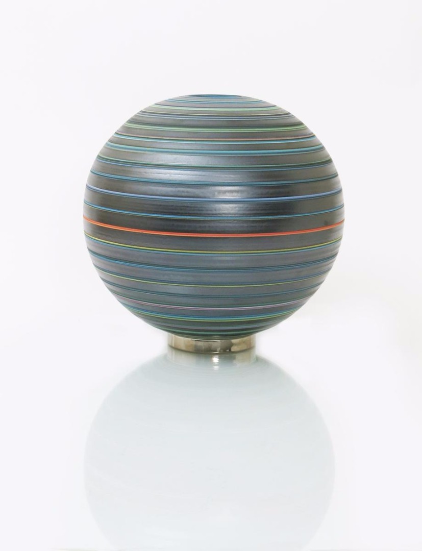 Orbit a unique Dennis Chinaworks Large Sphere vase designed by Sally Tuffin and Buchan Dennis, thrown by Rory McLeod, decorated by Natasha Chapman-Cox, painted with bands in colours, silver and metal oxide, impressed and painted marks, WW1, 2016, 36cm. high