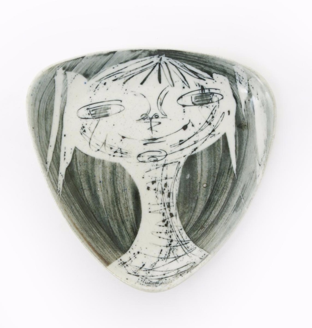 A Richard Parkinson Pottery School Girl plate designed by Susan Parkinson, triangular section, resist decorated in blue on a white ground with a school girl portrait impressed marks, 15.5cm. wide
