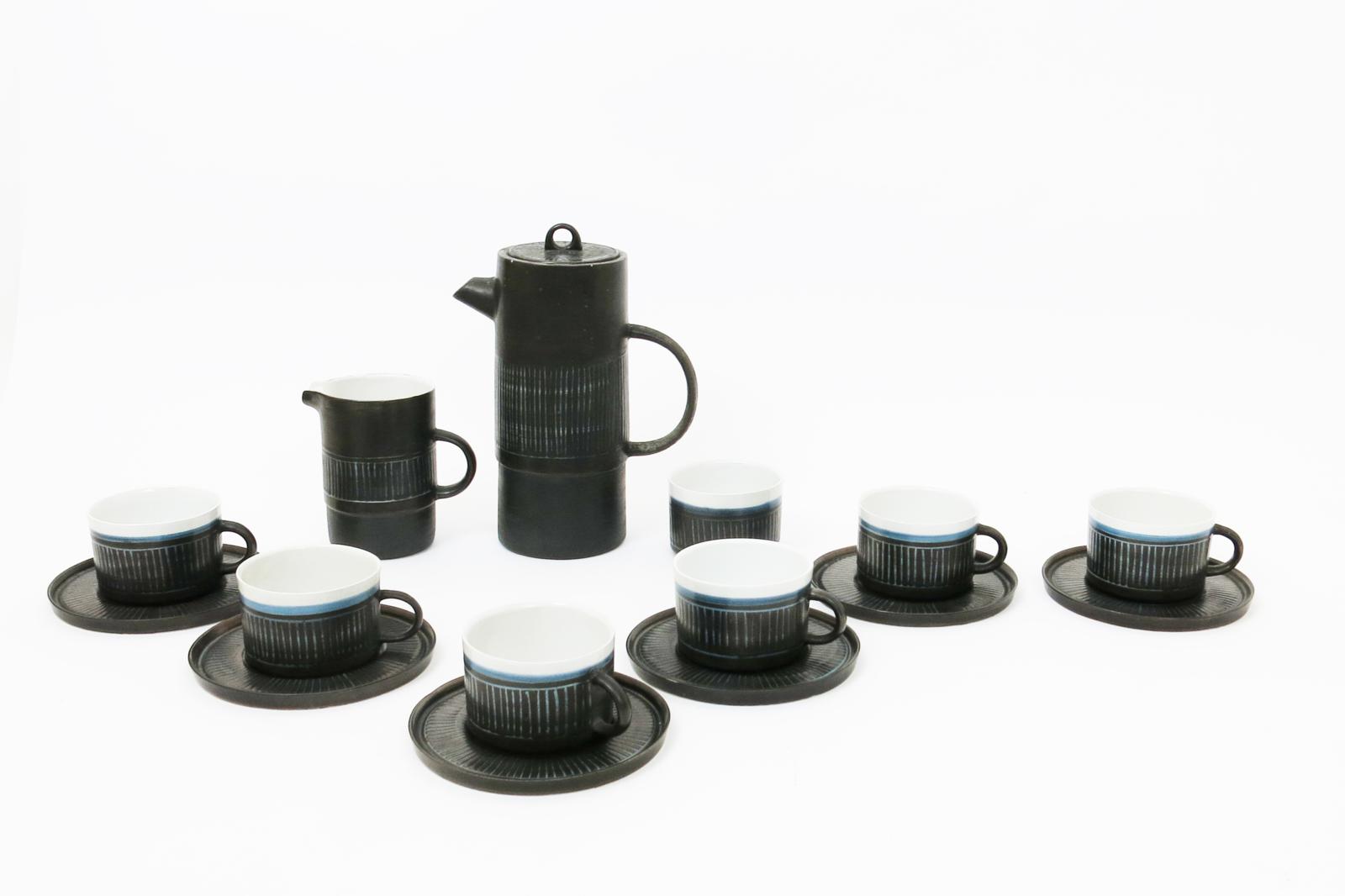 A Troika Pottery coffee set for six, designed by Benny Sirota, cylindrical form, sgraffito decorated with a band of blue lines under a black metallic glaze, comprising; coffee pot and cover, milk-jug and sugar basin, six cups and saucers unsigned 26cm. high (coffee pot)