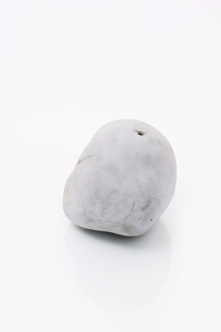 Sky Grey Vessel with Two Holes and a Line, 1997, a stoneware hand-built pebble form covered with thick applied white paint, incised GB monogram, 97, 26cm. wide.