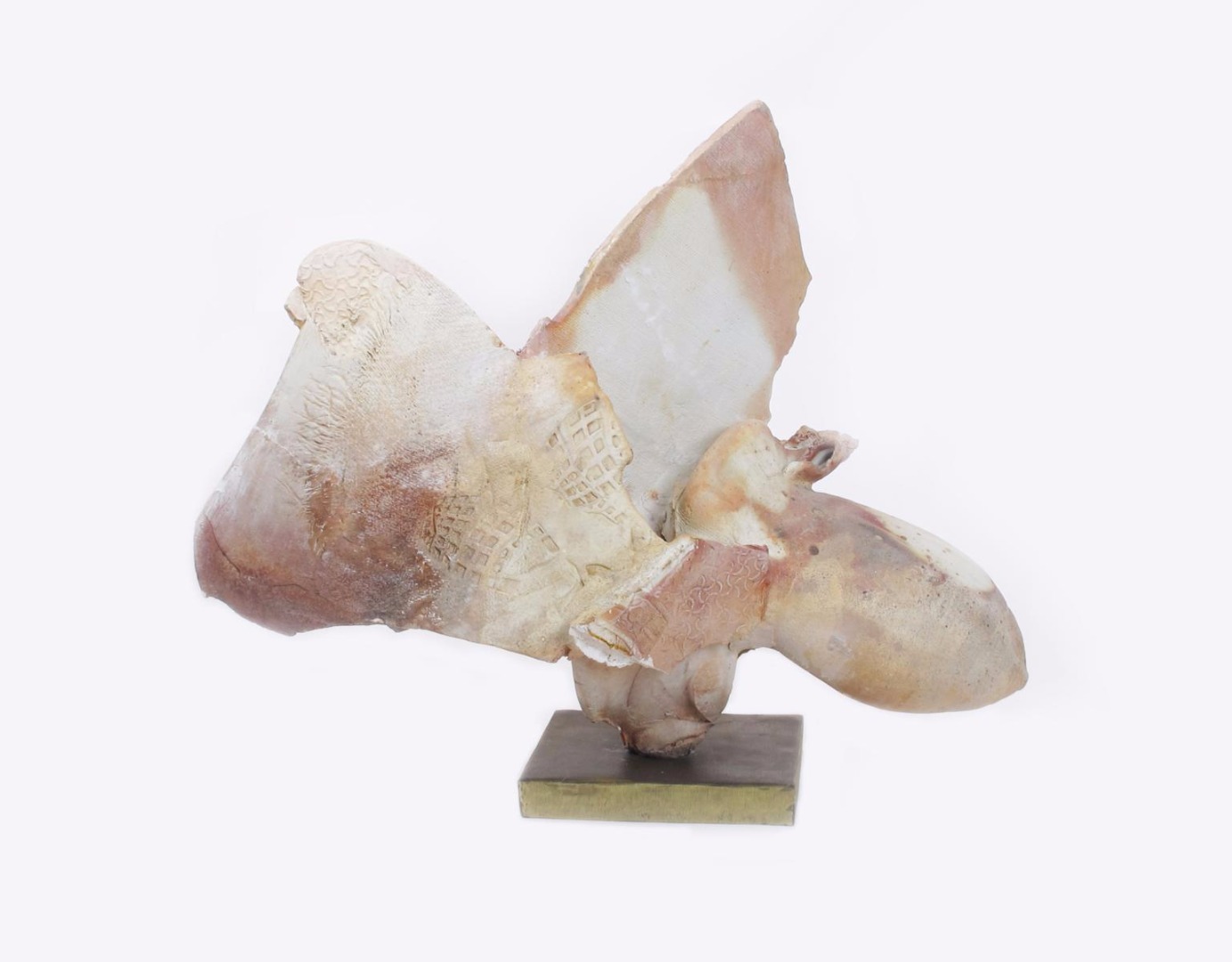 large winged form, a large American Raku sculpture on metal base, numbered 978, 73cm. high, 95cm. wide