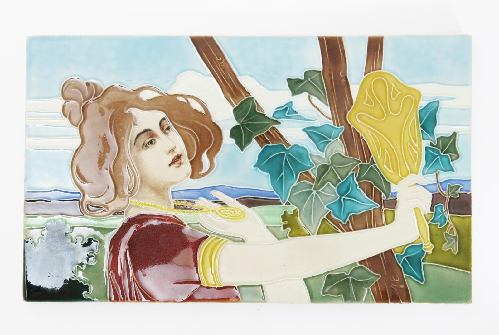 An Art Nouveau tile plaque designed by Carl Luber, probably manufactured by Johann Von Schwarz, modelled as a lady admiring herself in a hand-mirror, glazed in colours impressed CH 097, painted XII, 28 x 16.5cm.