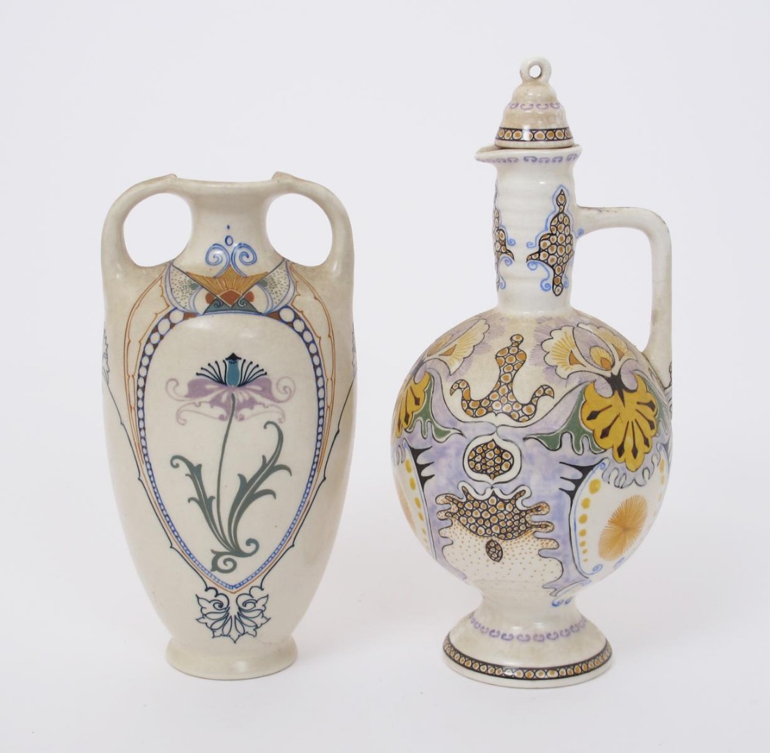 An Art Nouveau Gouda Pottery ewer and cover by Helena F, painted with stylised flowers and foliage in colours on a cream ground, an Arnhem pottery twin-handled vase printed and painted marks, Arnhem vase chipped top rim with chip missing, 26cm. high. (2).