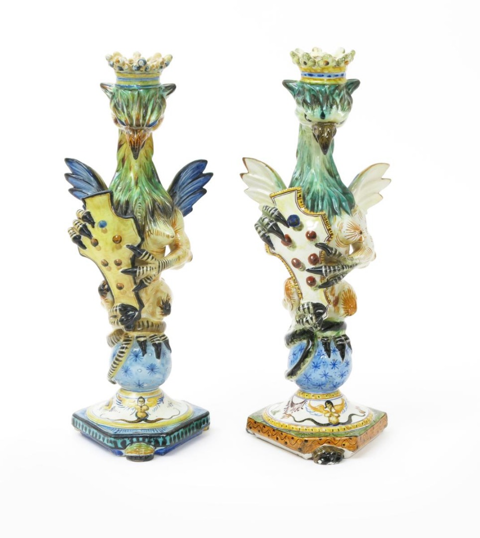 A pair of Cantagalli pottery grotesque candlesticks, each modelled as a heraldic griffin wearing a crown and holding a shield, painted in colours painted cockerel mark, professional restoration to wing of one and minor restoration to spine of other, 34cm. high (2)