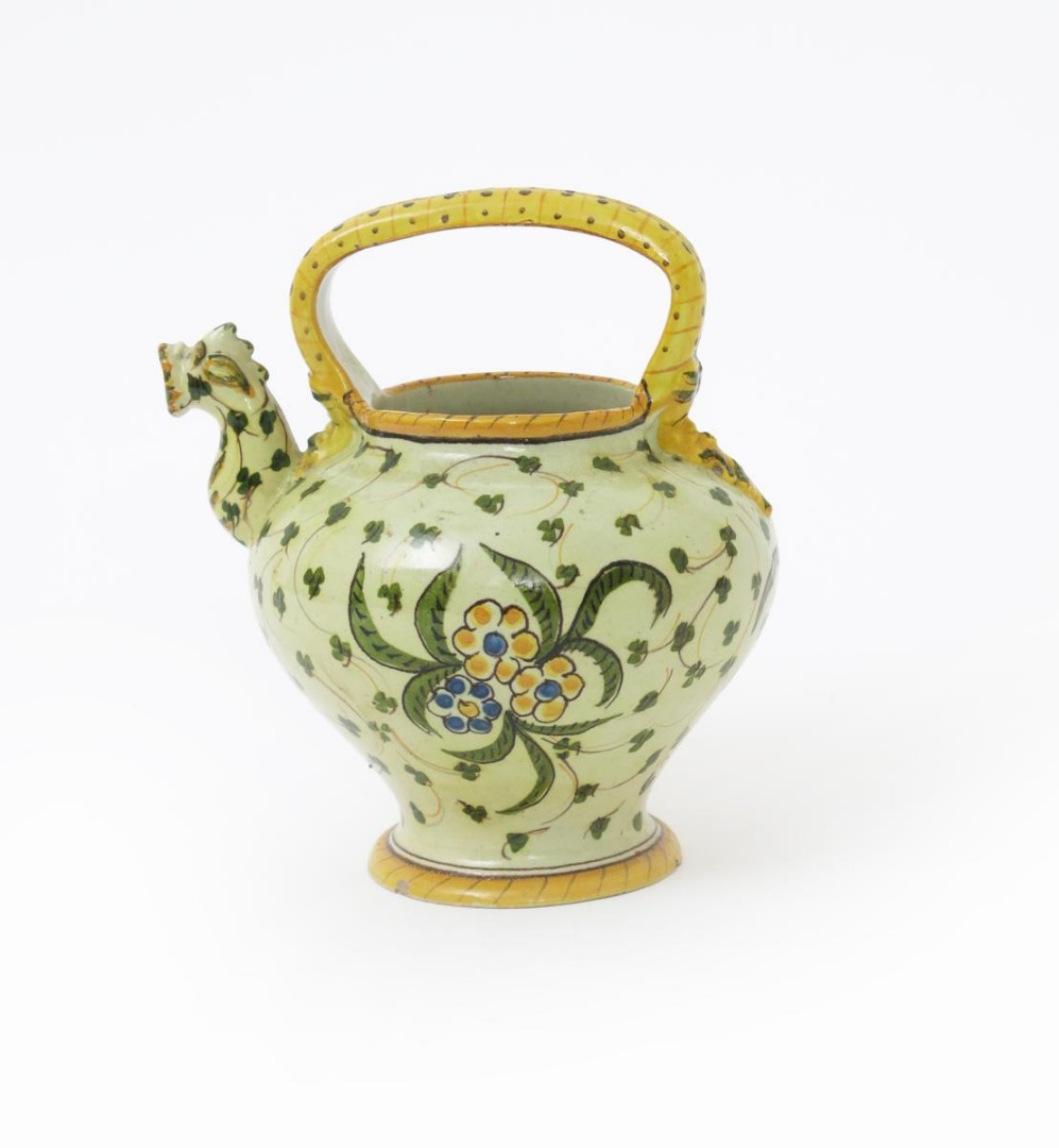 A Cantagalli pottery wine jug, ovoid with grotesque spout and over-slung handle, painted with stylised flowers on a pale yellow ground, painted cockerel mark, small glaze frit to spout, 18.5cm. high
