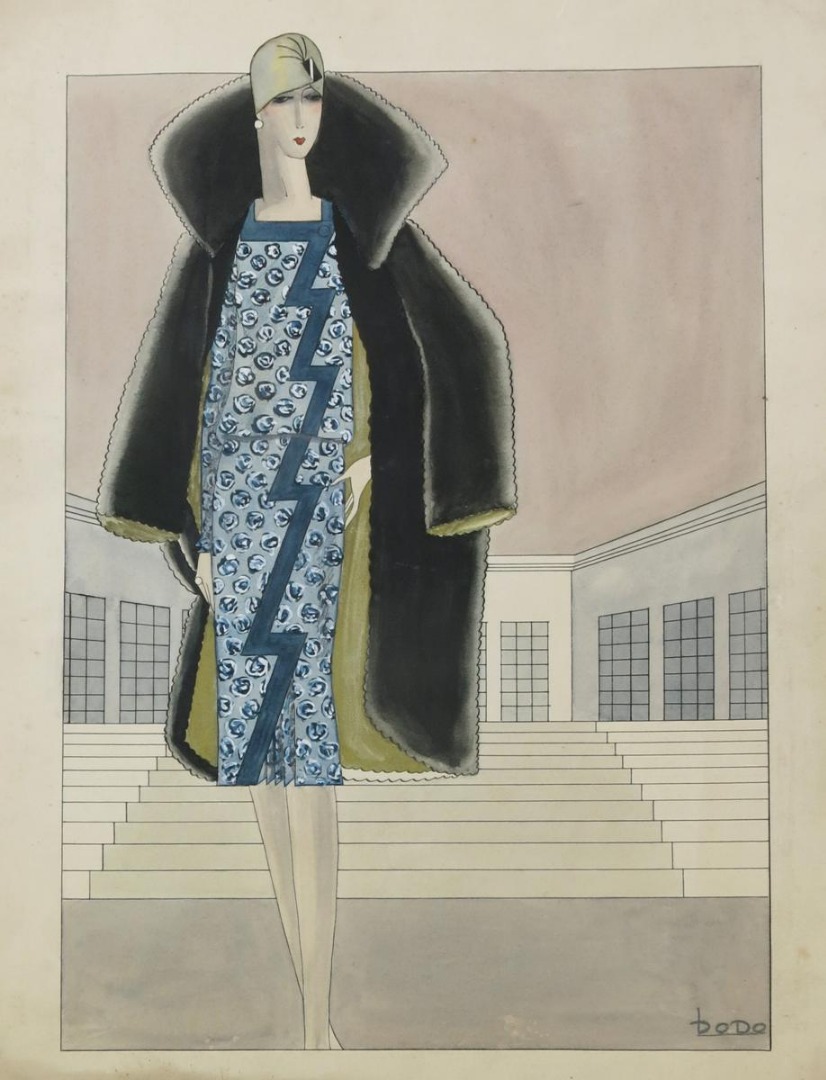 a pen, ink and watercolour fashion design of an Art Deco woman before a building,