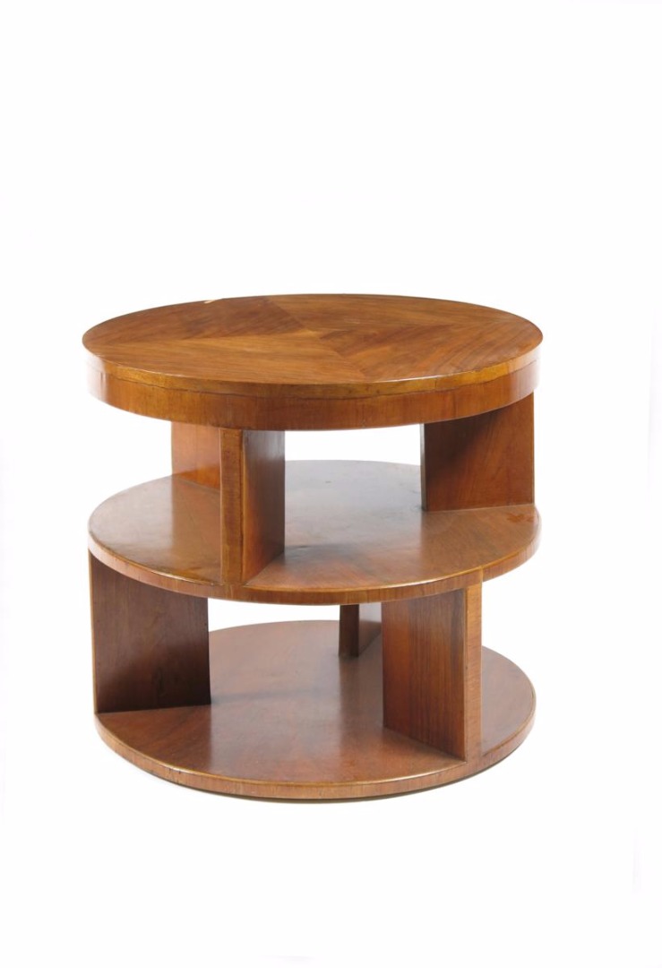 An Art Deco quartered walnut veneer table in the manner of Heal's, circular with offset bookshelves below, 61cm. diam.