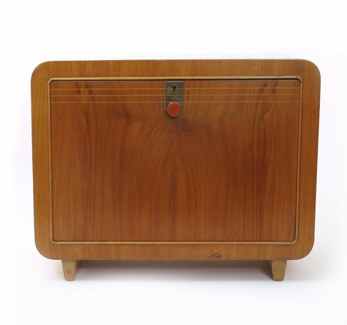 A Modernist Laszlo Hoenig blonde beech desk top bureau, the fall-front door with bakelite circular handle and polished brass fittings, applied label to reverse 68cm. wide, 54cm. high, 26cm. deep.