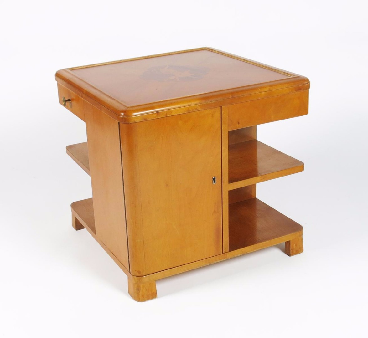 An Art Deco satinwood occasional table probably by Laszlo Hoenig, square section, with twin cupboards, drawers and shelves, the top inlaid with marquetry panel of Diana the huntress, with metal furniture, unsigned 61cm. square, 58cm. high