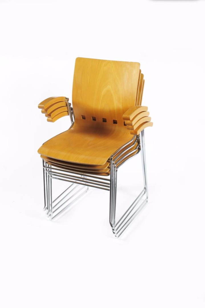 A set of four Herman Miller bentwood and chromed metal stacking armchairs