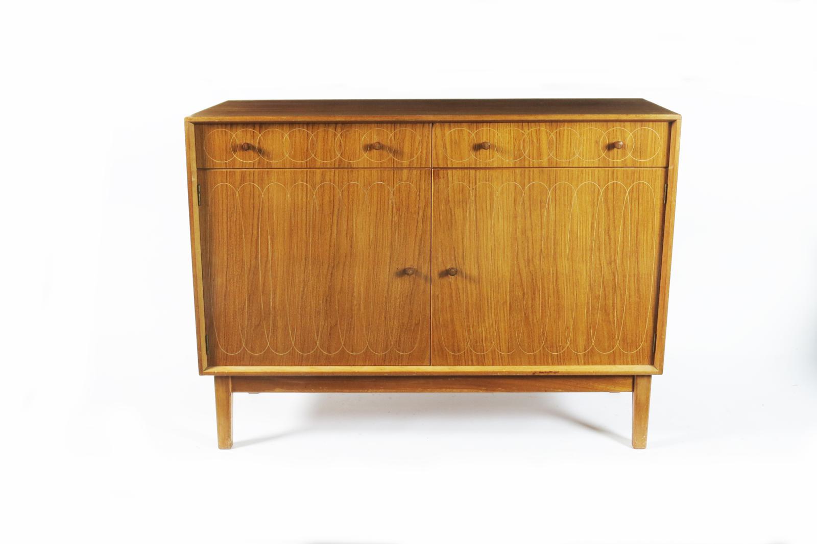 A Gordon Russell mahogany sideboard designed by David Booth and Judith Ledeboer, designed in 1951, the twin drawers with routed circles, the twin cupboards routed with ellipses, with applied label to reverse, 92cm. high, 122cm. wide, 43cm. deep.