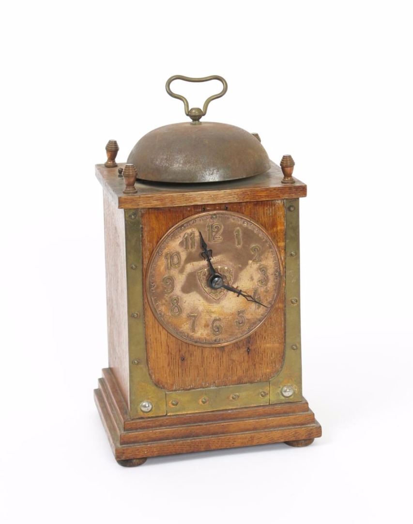 A Continental Secessionist mantel clock, the rectangular oak frame set with brass plates and circular copper dial, with Arabic numerals, 27.5cm. high