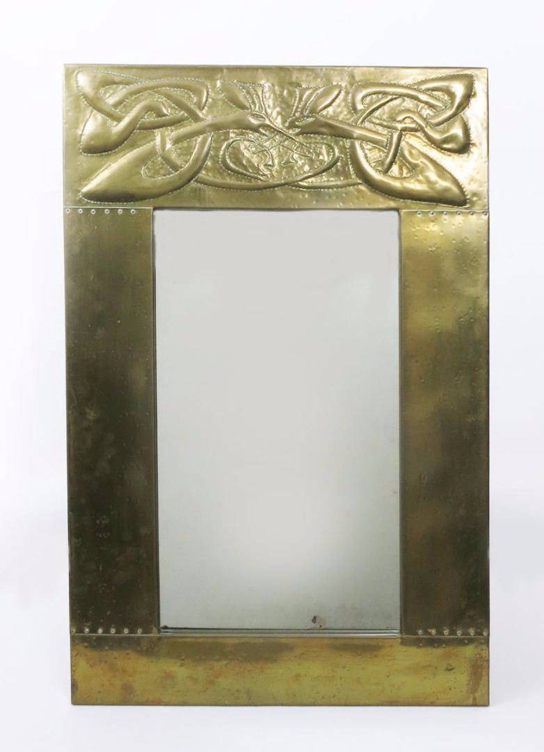 A large hammered brass wall mirror possibly designed by Harry Silver for Liberty & Co, rectangular, hammered with a panel of two conjoined birds issuing from Celtic knot motif, with stud work decoration, unsigned, 92 x 61cm.