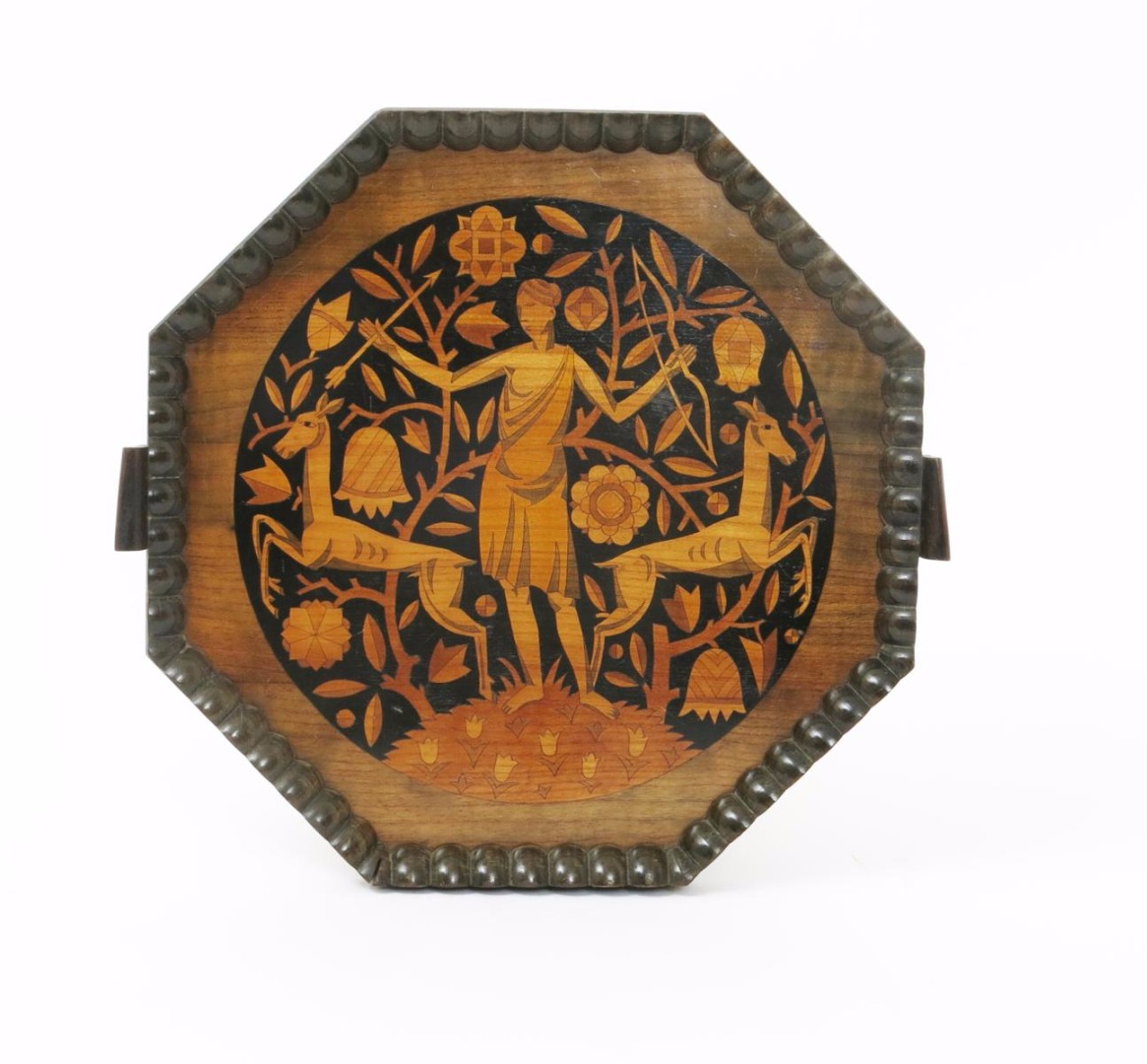 An Art Deco octagonal marquetry twin-handled tray, the well decorated with a marquetry panel of Diana the Huntress, indistinct stamped mark to reverse 41cm. wide.
