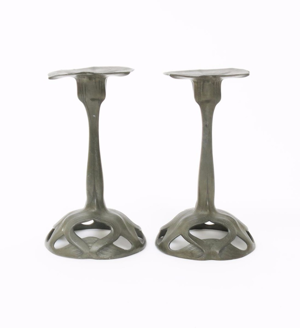 A pair of Art Nouveau Orivit candlesticks, model no.2284, the pierced domed base cast with stylised foliage, with flaring floriform sconce, stamped mark, 18.5cm. high, (2).